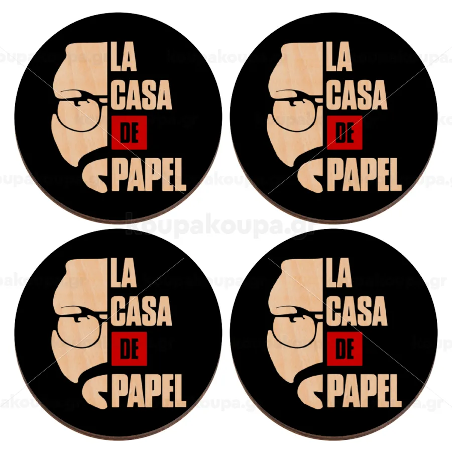 La casa de papel, ΣΕΤ x4 Σουβέρ ξύλινα στρογγυλά plywood (9cm)