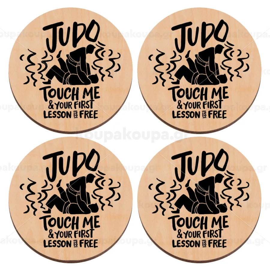 Judo Touch Me And Your First Lesson Is Free, ΣΕΤ x4 Σουβέρ ξύλινα στρογγυλά plywood (9cm)