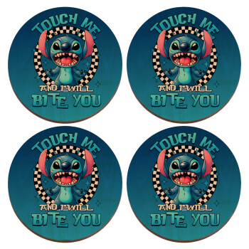 Stitch Touch Me And I Will Bite You, ΣΕΤ x4 Σουβέρ ξύλινα στρογγυλά plywood (9cm)