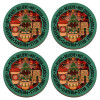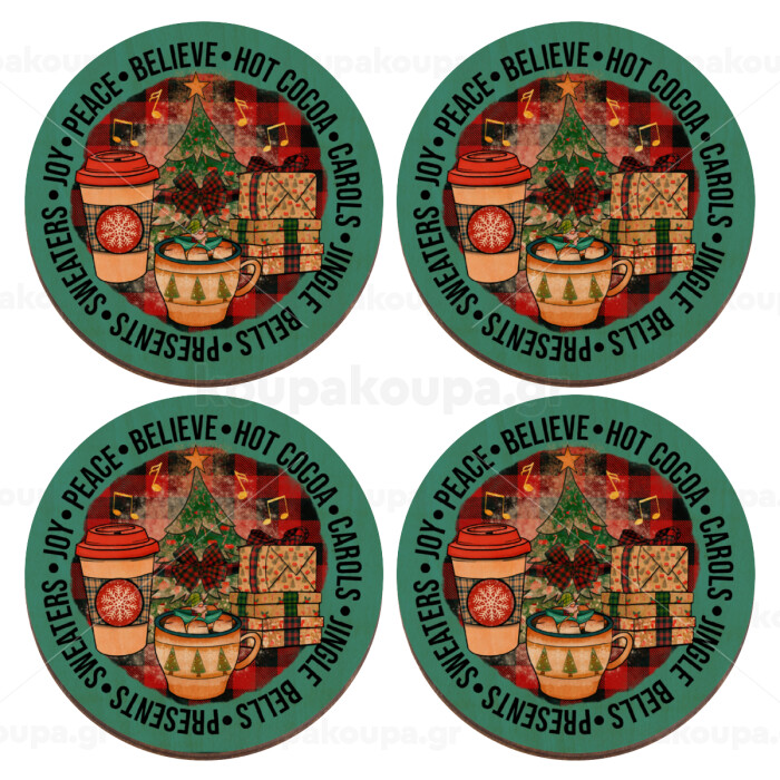 Joy, Peace, Believe, Hot Cocoa, Carols, ΣΕΤ x4 Σουβέρ ξύλινα στρογγυλά plywood (9cm)