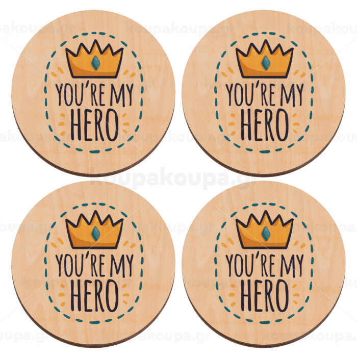 Dad, you are my hero!, ΣΕΤ x4 Σουβέρ ξύλινα στρογγυλά plywood (9cm)