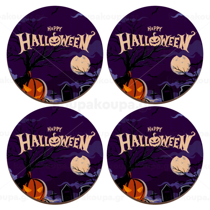 Happy Halloween cemetery, ΣΕΤ x4 Σουβέρ ξύλινα στρογγυλά plywood (9cm)