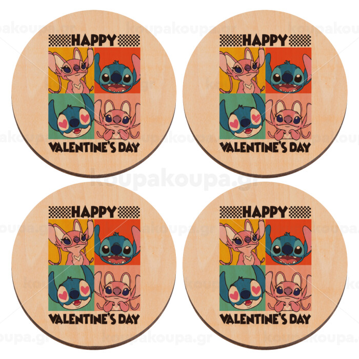 Lilo & Stitch Happy valentines day, ΣΕΤ x4 Σουβέρ ξύλινα στρογγυλά plywood (9cm)