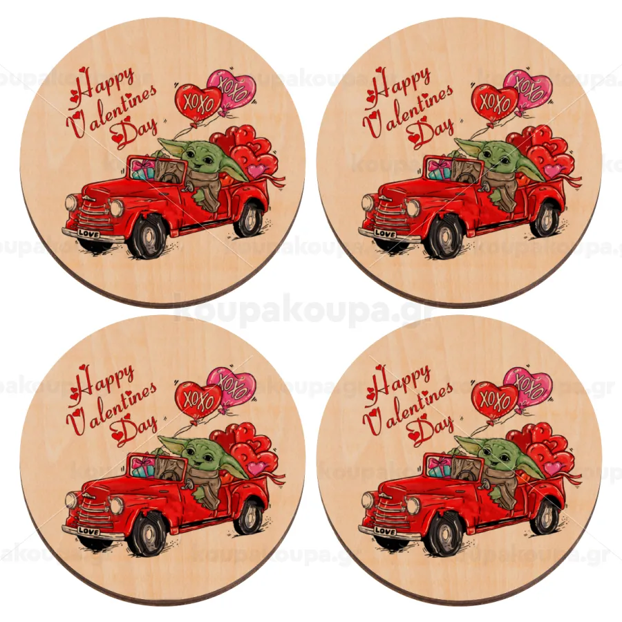 Yoda, happy valentines day (xoxo), ΣΕΤ x4 Σουβέρ ξύλινα στρογγυλά plywood (9cm)