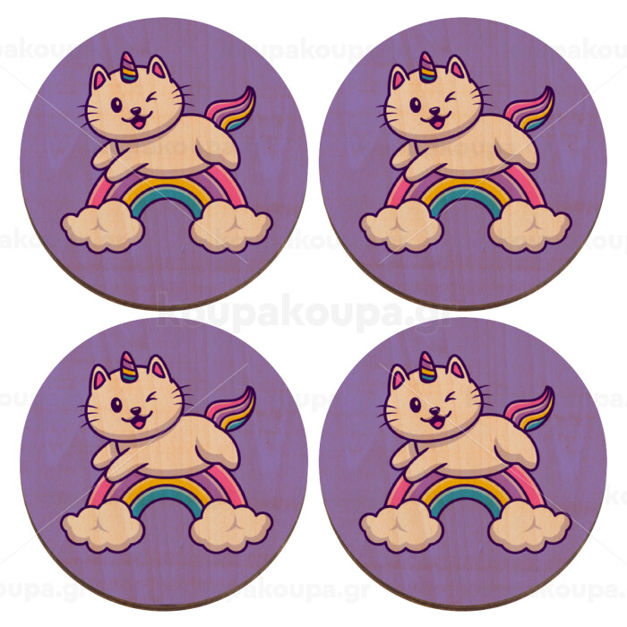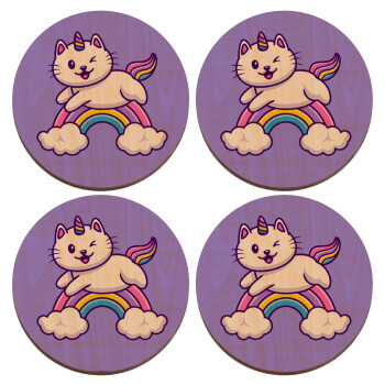 Cute cat unicorn, ΣΕΤ x4 Σουβέρ ξύλινα στρογγυλά plywood (9cm)