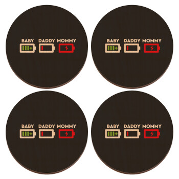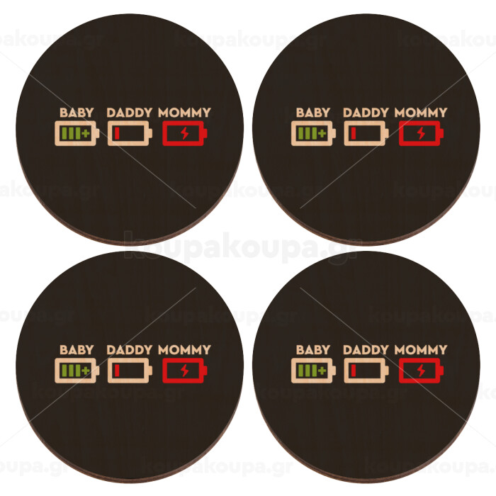 BABY, MOMMY, DADDY Low battery, ΣΕΤ x4 Σουβέρ ξύλινα στρογγυλά plywood (9cm)