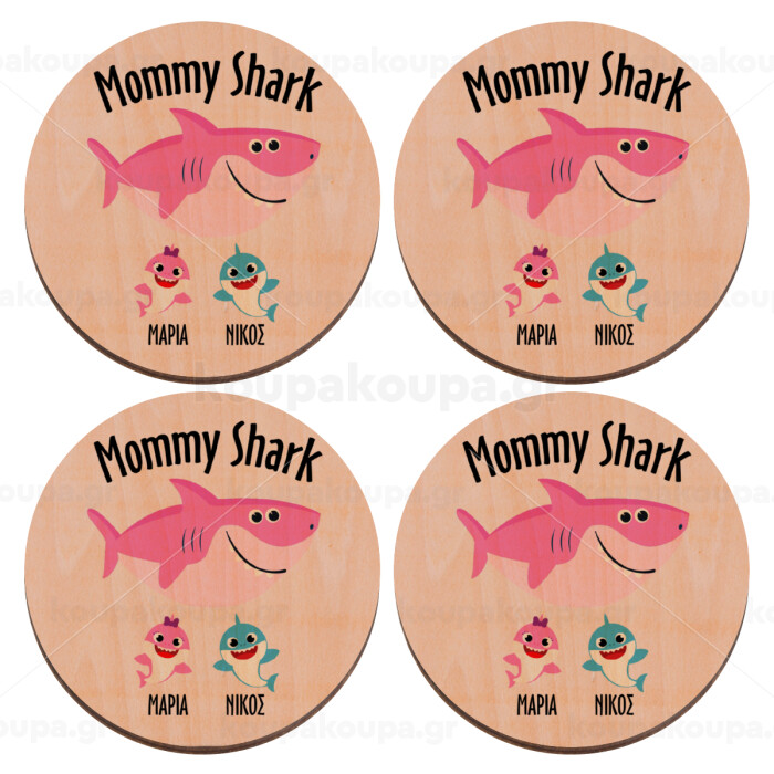 Mommy Shark (με ονόματα παιδικά), ΣΕΤ x4 Σουβέρ ξύλινα στρογγυλά plywood (9cm)