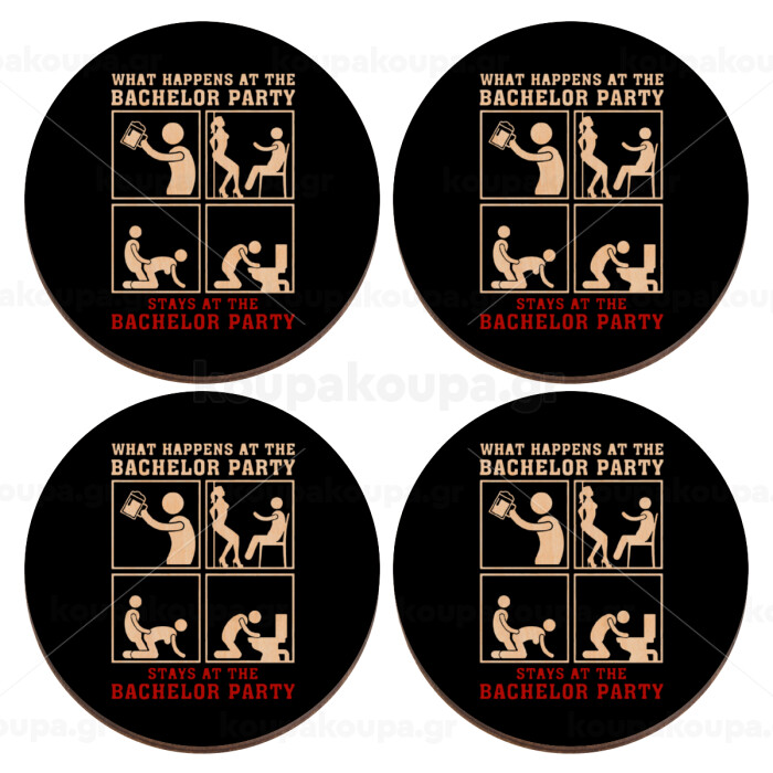 What happens at the bachelor party, stays at the bachelor party!, ΣΕΤ x4 Σουβέρ ξύλινα στρογγυλά plywood (9cm)