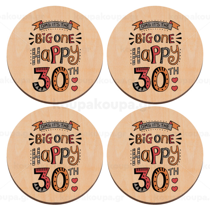Big one Happy 30th, ΣΕΤ x4 Σουβέρ ξύλινα στρογγυλά plywood (9cm)