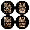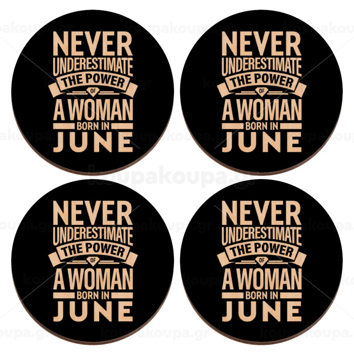 Never Underestimate the poer of a Woman born in..., ΣΕΤ x4 Σουβέρ ξύλινα στρογγυλά plywood (9cm)