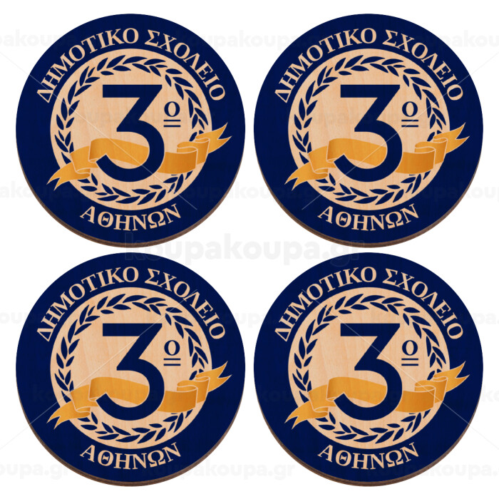 Έμβλημα Σχολικό μπλε, ΣΕΤ x4 Σουβέρ ξύλινα στρογγυλά plywood (9cm)