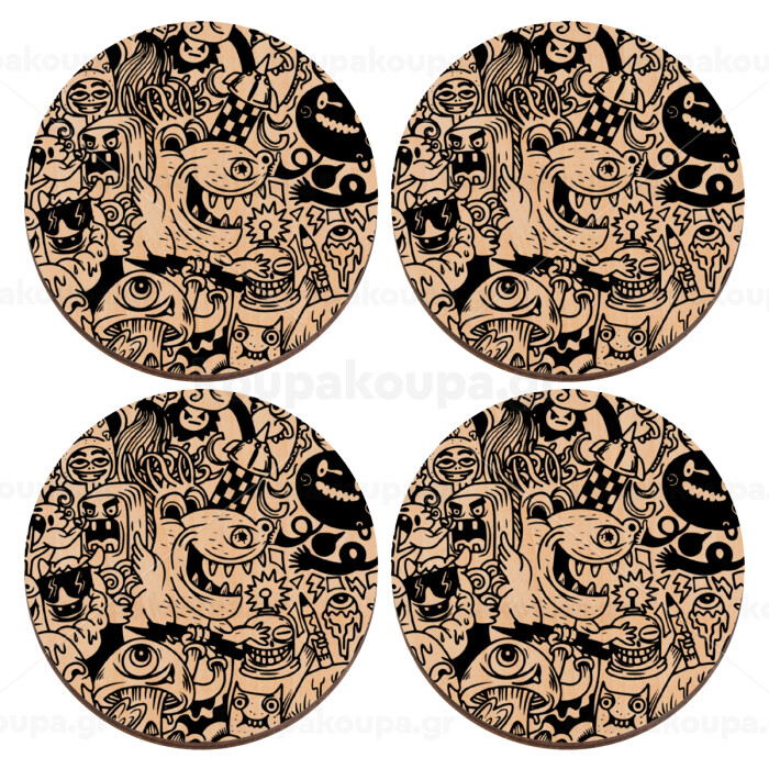 Τερατάκια, ΣΕΤ x4 Σουβέρ ξύλινα στρογγυλά plywood (9cm)