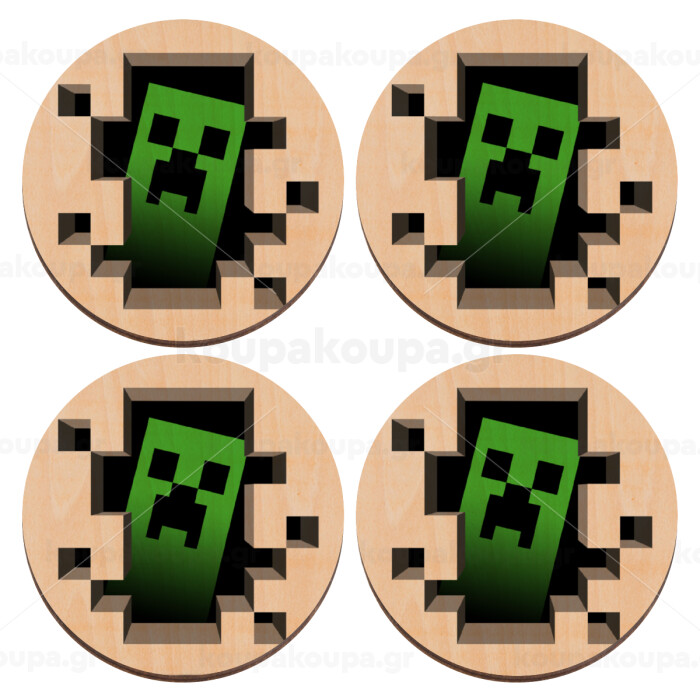 Minecraft creeper, ΣΕΤ x4 Σουβέρ ξύλινα στρογγυλά plywood (9cm)