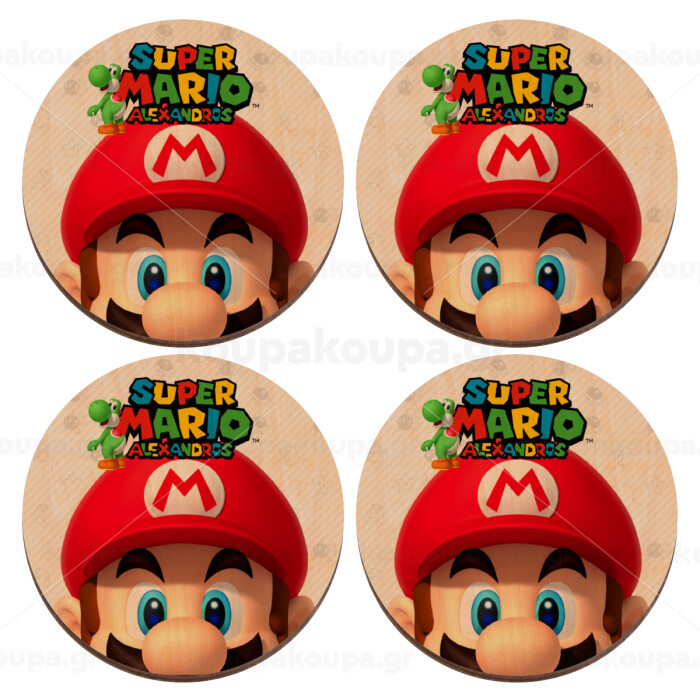 Super mario head, ΣΕΤ x4 Σουβέρ ξύλινα στρογγυλά plywood (9cm)