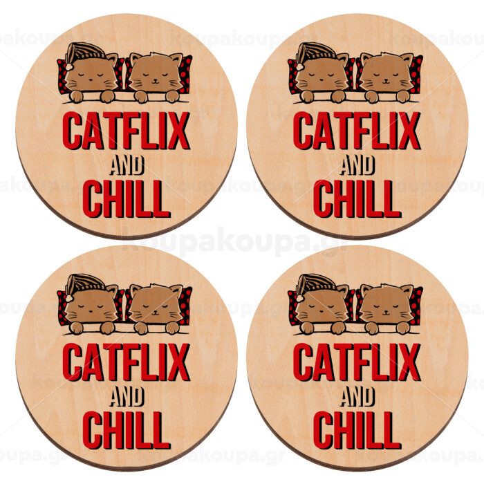 Catflix and Chill, ΣΕΤ x4 Σουβέρ ξύλινα στρογγυλά plywood (9cm)