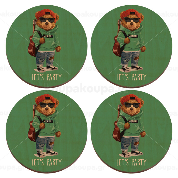 Let's Party Bear, ΣΕΤ x4 Σουβέρ ξύλινα στρογγυλά plywood (9cm)