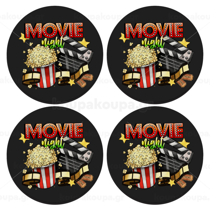 Movie night, SET of 4 round wooden coasters (9cm)