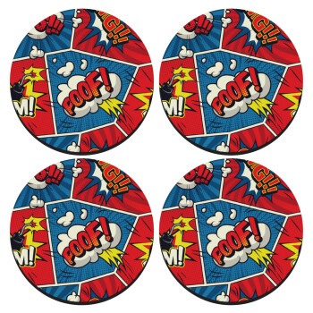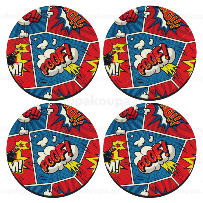Comic boom!, SET of 4 round wooden coasters (9cm)