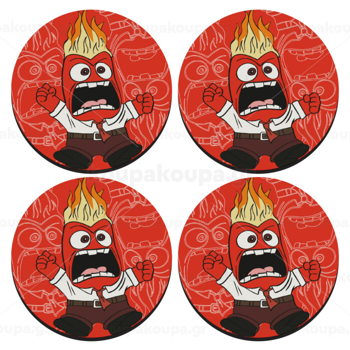 Inside Out Angry, SET of 4 round wooden coasters (9cm)