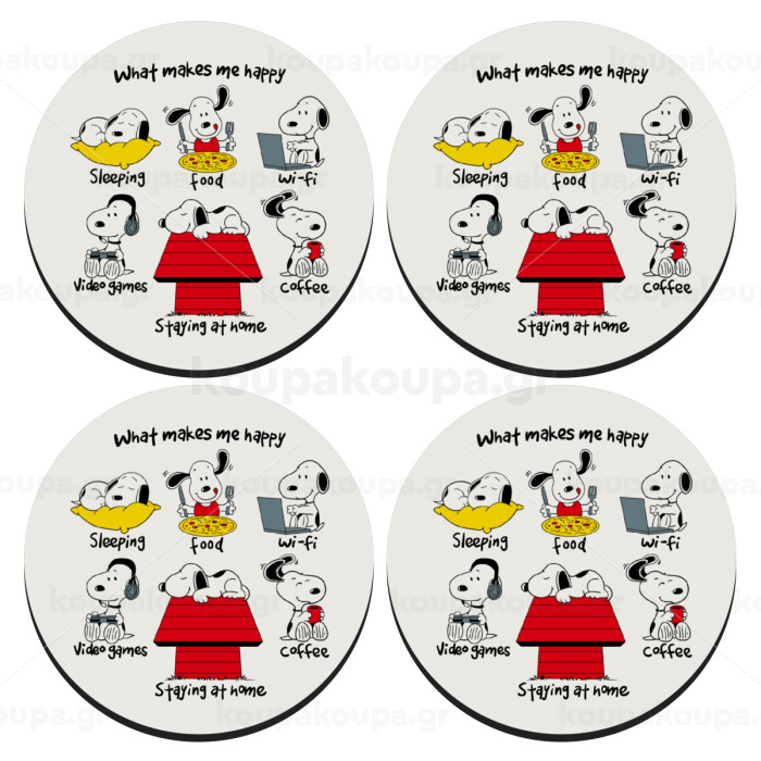 Snoopy what makes my happy, SET of 4 round wooden coasters (9cm)