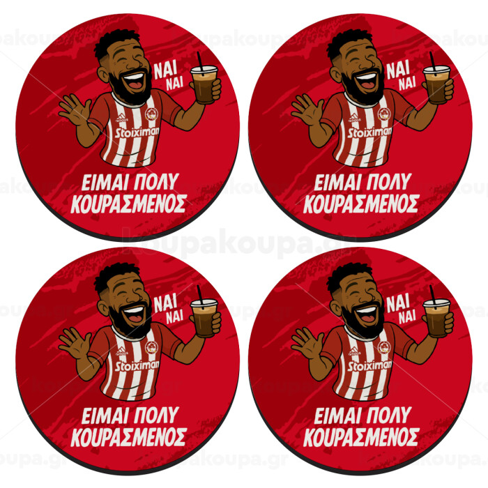 Ροντινέι, "ΠΟΛΥ ΚΟΥΡΑΣΜΕΝΟΣ", SET of 4 round wooden coasters (9cm)