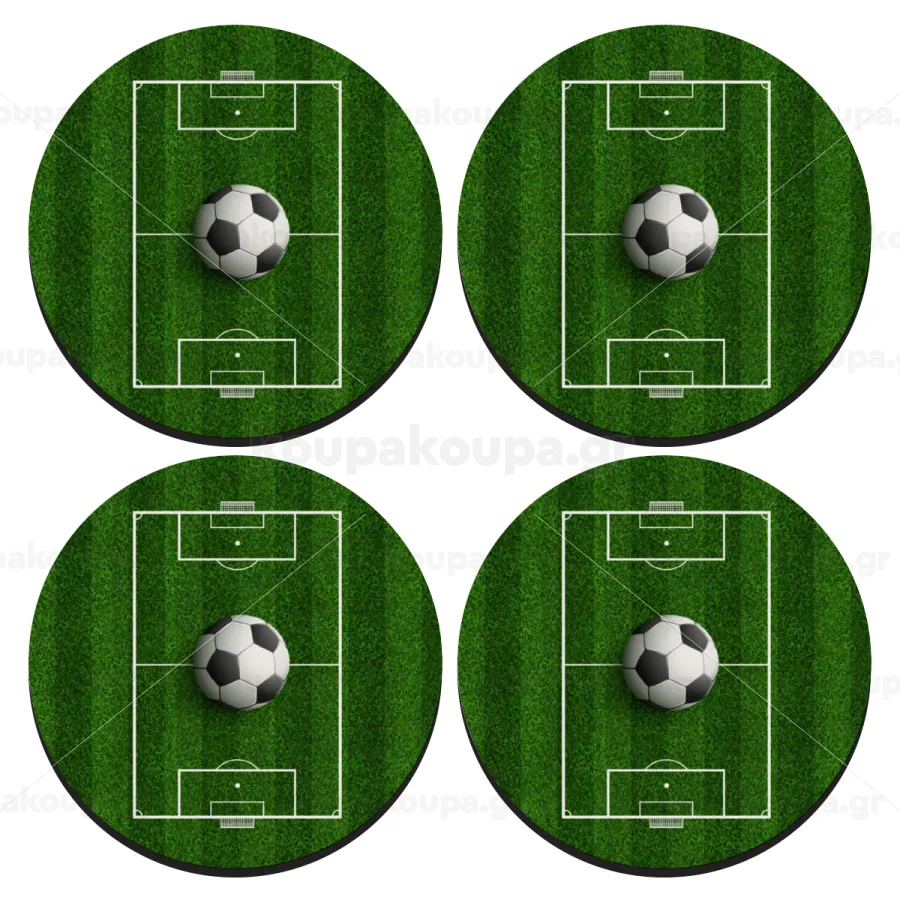 Soccer field, Γήπεδο ποδοσφαίρου, SET of 4 round wooden coasters (9cm)