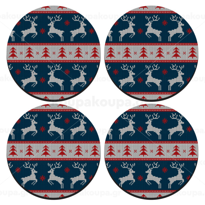 Deer knitted blue, SET of 4 round wooden coasters (9cm)