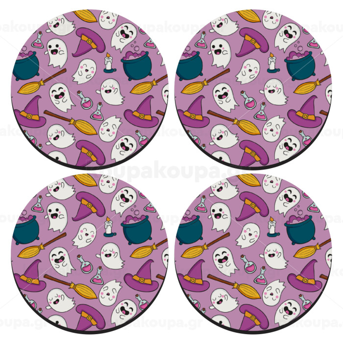 Happy Halloween pink, SET of 4 round wooden coasters (9cm)