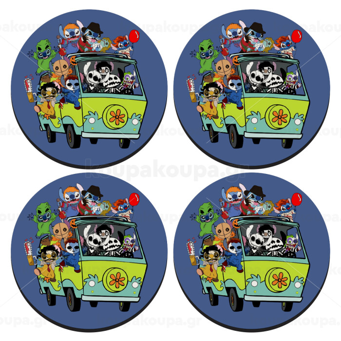 Stitch Halloween scooby car, SET of 4 round wooden coasters (9cm)