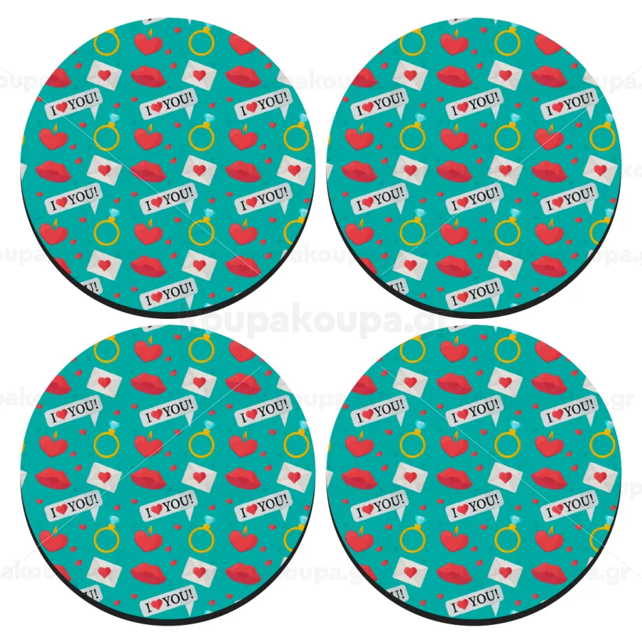I Love You hearts rings & kiss pattern, SET of 4 round wooden coasters (9cm)