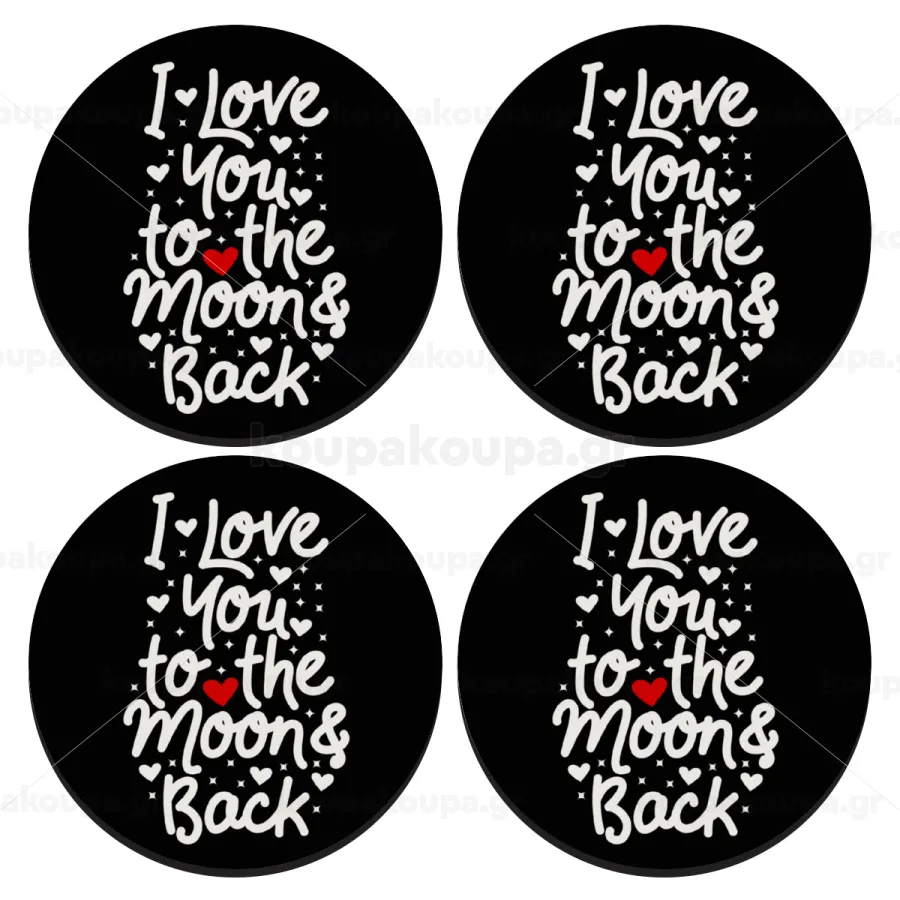 I love you to the moon and back with hearts, SET of 4 round wooden coasters (9cm)