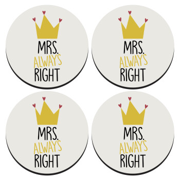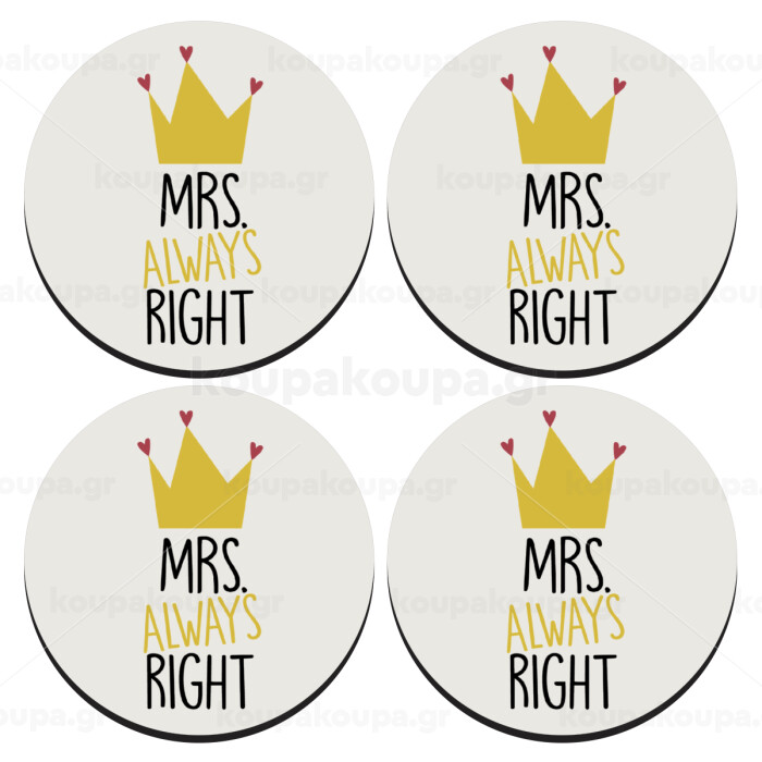 Mrs "Always" right, SET of 4 round wooden coasters (9cm)