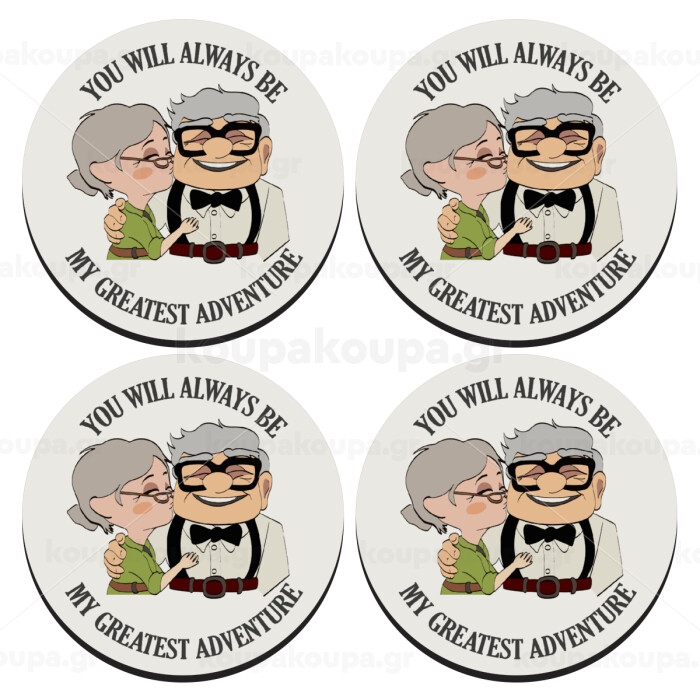 UP, YOU WILL ALWAYS BE MY GREATEST ADVENTURE, SET of 4 round wooden coasters (9cm)