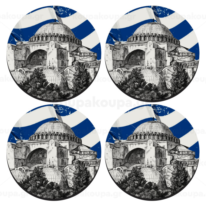 Αγία Σοφιά Ελληνική σημαία, SET of 4 round wooden coasters (9cm)
