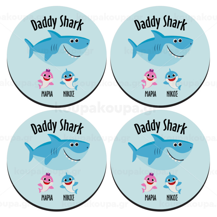 Daddy Shark (με ονόματα παιδικά), SET of 4 round wooden coasters (9cm)