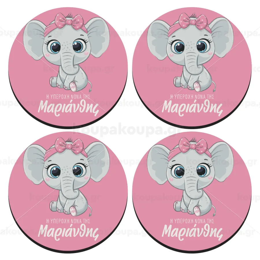 Η νονά μου, ελεφαντάκι ροζ, SET of 4 round wooden coasters (9cm)