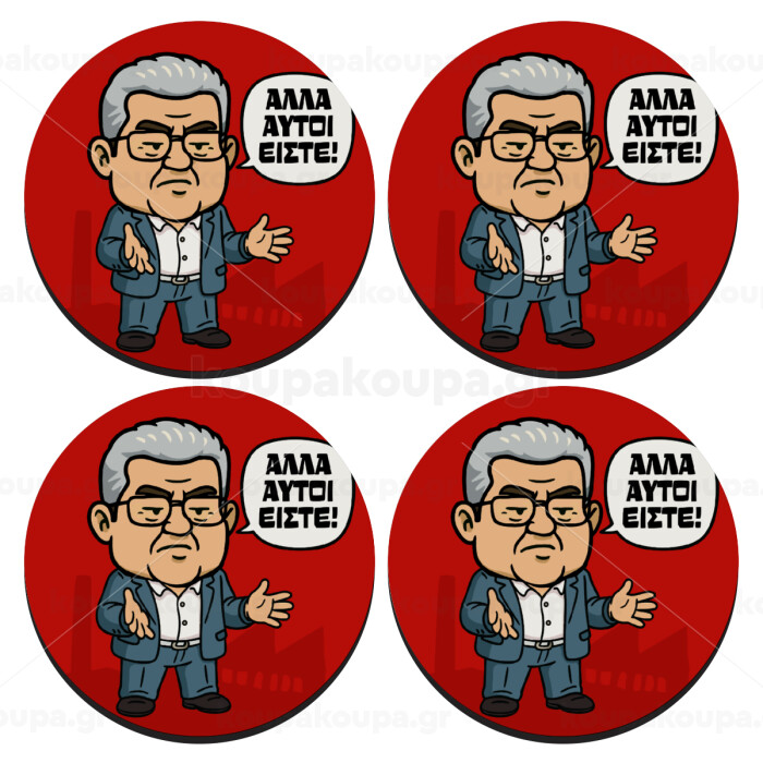 Κουτσούμπας, "Αλλά αυτοί είστε!", SET of 4 round wooden coasters (9cm)
