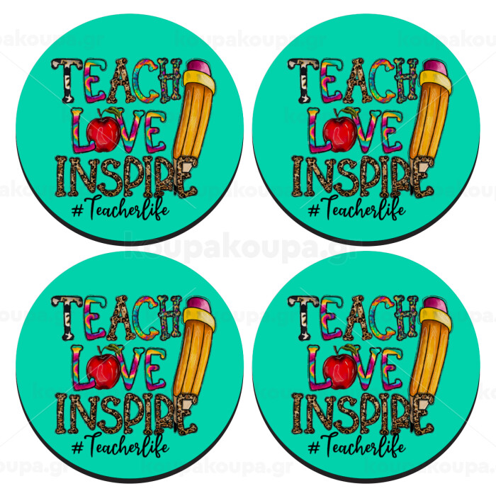 Teach, Love, Inspire, SET of 4 round wooden coasters (9cm)