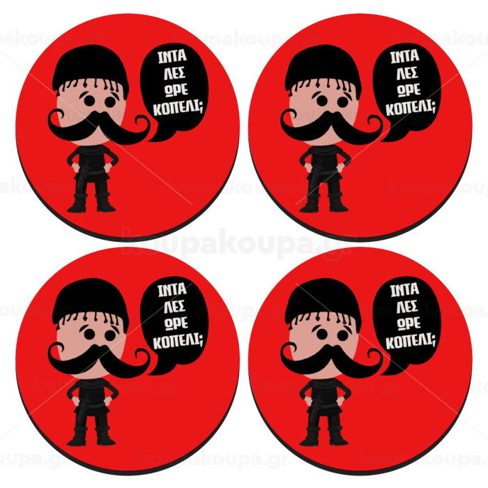 Κρητικός "Ίντα λες ωρέ κοπέλι", SET of 4 round wooden coasters (9cm)