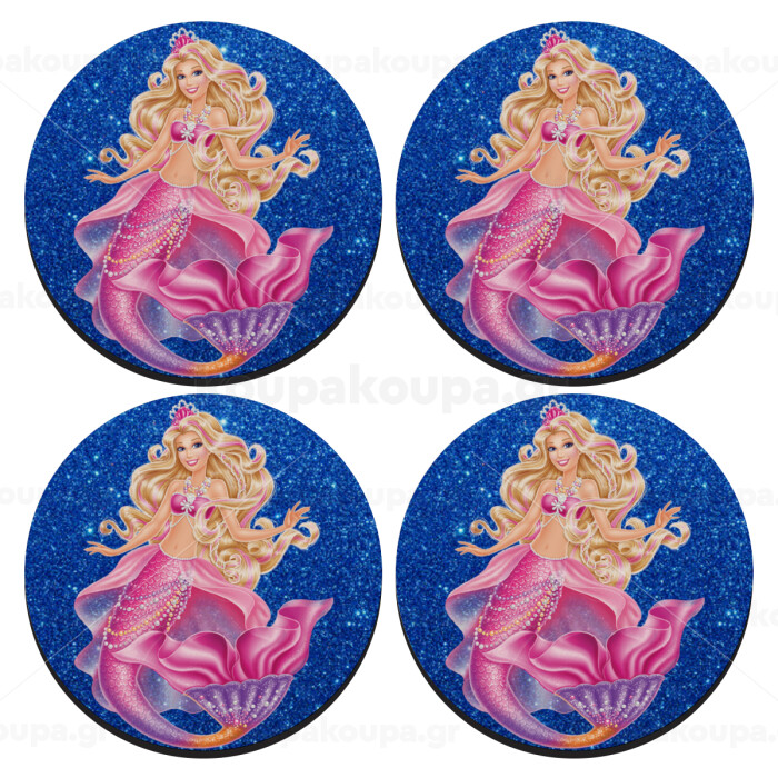 Barbie mermaid blue, SET of 4 round wooden coasters (9cm)