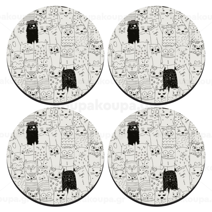Γάτες γραμμικό σχέδιο, SET of 4 round wooden coasters (9cm)