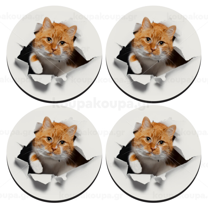 Cat cracked, SET of 4 round wooden coasters (9cm)