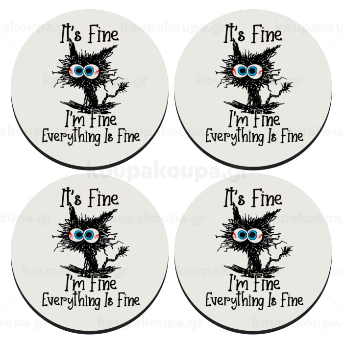 Cat, It's Fine I'm Fine Everything Is Fine, SET of 4 round wooden coasters (9cm)