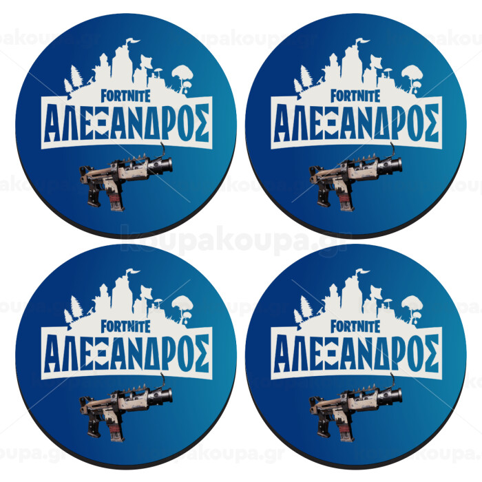 Fortnite with gun με το όνομα σου, SET of 4 round wooden coasters (9cm)