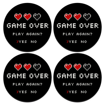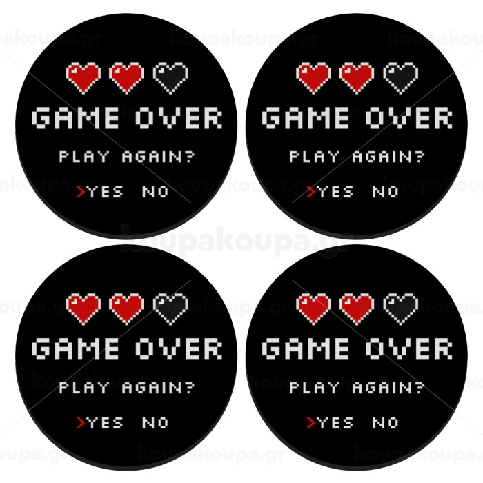 GAME OVER, Play again? YES - NO, SET of 4 round wooden coasters (9cm)