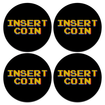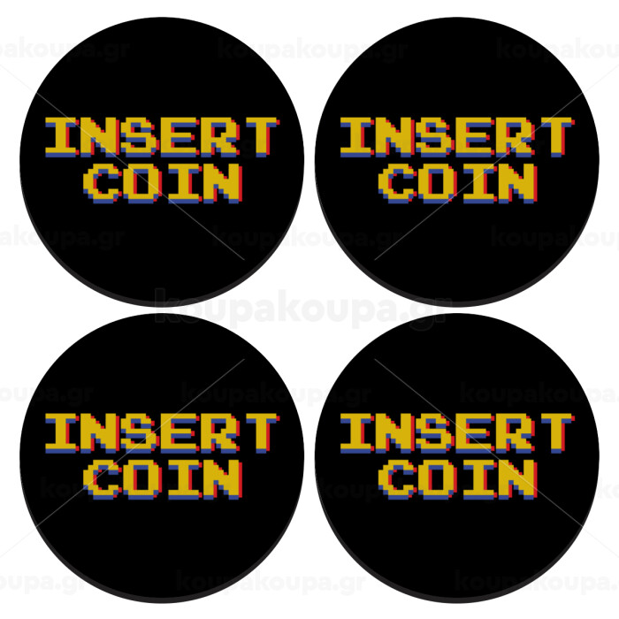 Insert coin!!!, SET of 4 round wooden coasters (9cm)