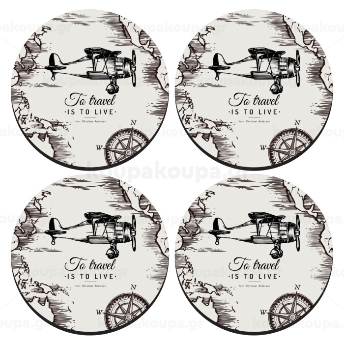To travel is to live, SET of 4 round wooden coasters (9cm)