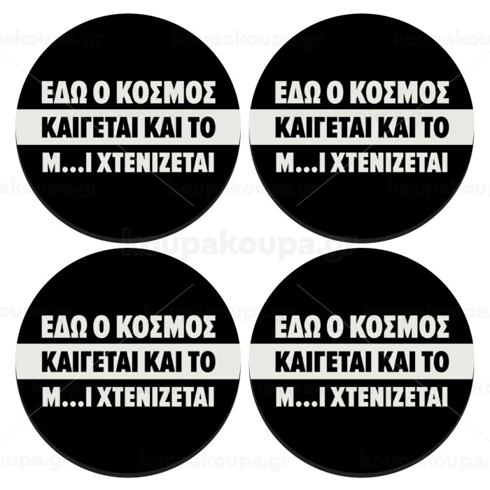 Εδώ ο κόσμος καίγεται και το Μ....Ι χτενίζεται, SET of 4 round wooden coasters (9cm)