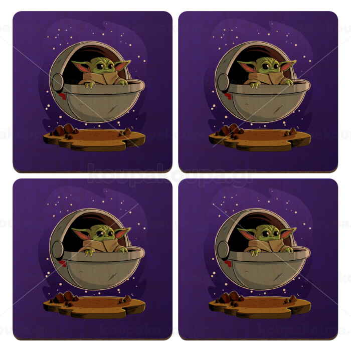 Baby Yoda mandalorian, ΣΕΤ x4 Σουβέρ ξύλινα τετράγωνα plywood (9cm)