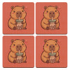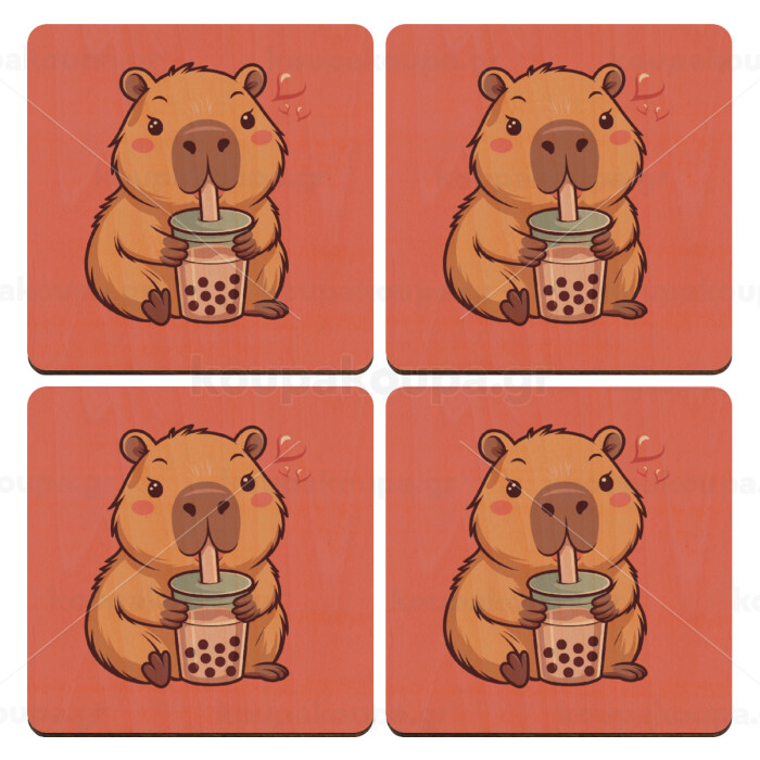 Capybara Bubble Tea, ΣΕΤ x4 Σουβέρ ξύλινα τετράγωνα plywood (9cm)
